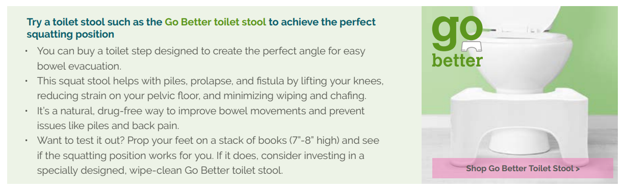 Pushing hard when going to the loo puts strain on your rectum and anus and can cause the blood vessels to swell making piles develop. The Go Better Stool will help you pass poop without having to strain.